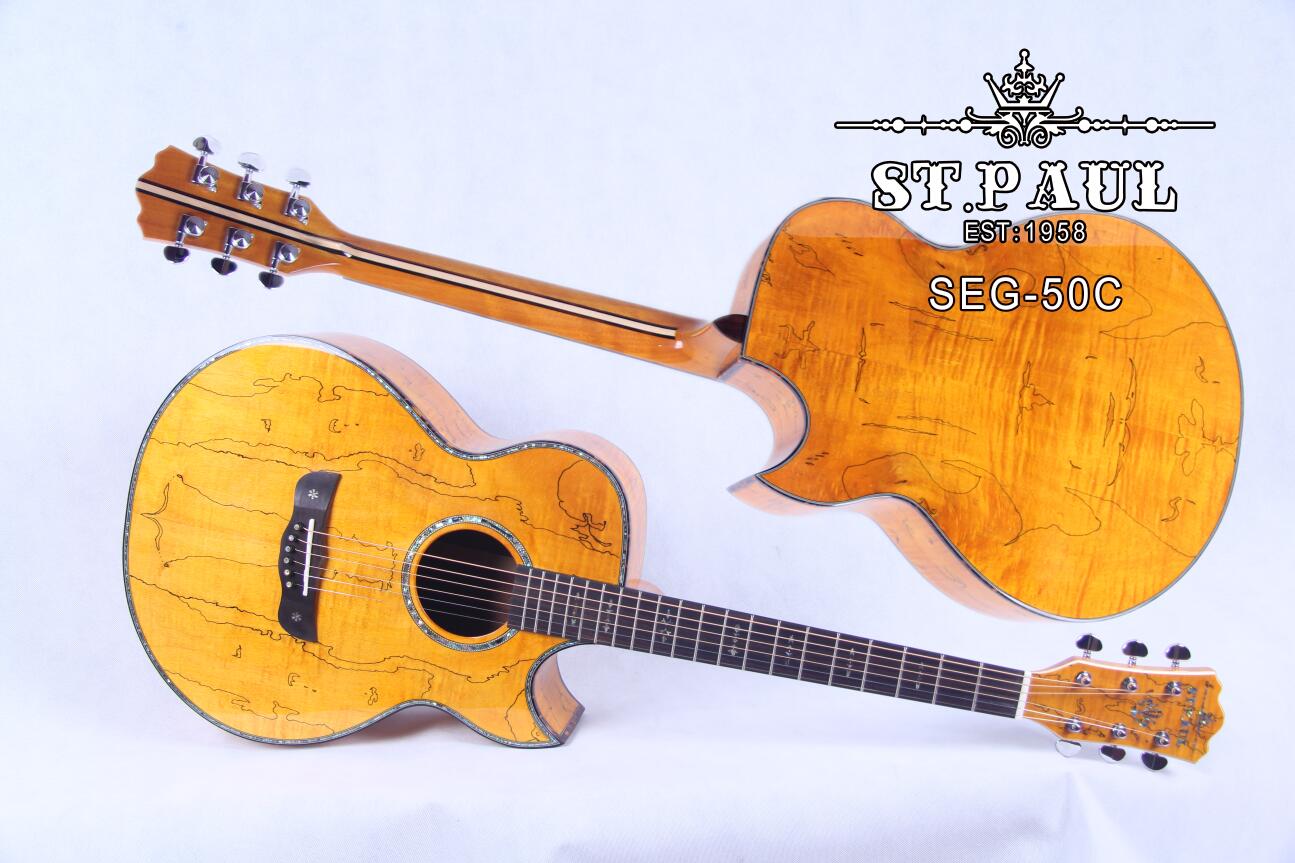 ST.PAUL 圣保羅SEG-50C 是一款天然沼澤虎紋楓木制作的手工吉他。采用韓國進口鎖弦弦鈕,吉他尾部出廠即開好12毫米的尾口,方便掛背帶的同時,又方便隨時改裝拾音器的人性化設計。整體吉他的板材地圖紋路與琥珀邊條的完美設計相結合,將其美感體現的淋漓盡致。