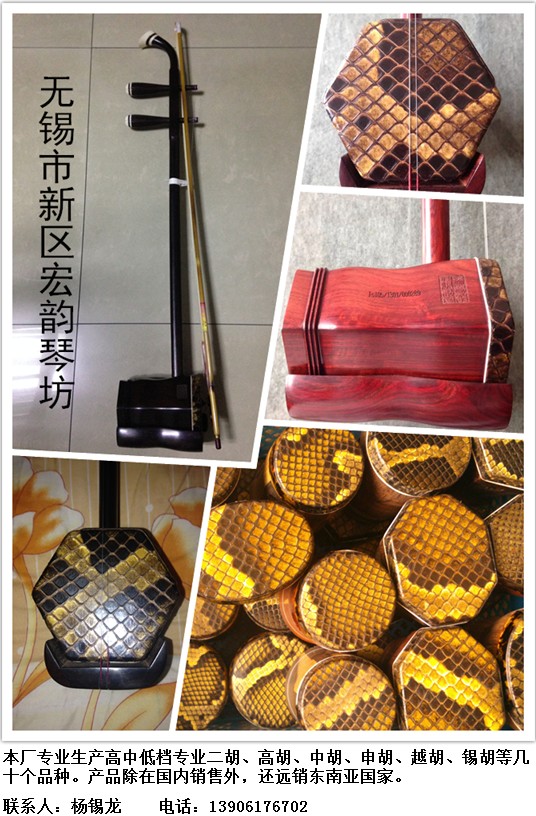 無(wú)錫市新區(qū)宏韻琴坊專(zhuān)業(yè)生產(chǎn)高中低檔專(zhuān)業(yè)二胡、高胡、中胡、申胡、越胡、錫胡等幾十個(gè)品種。本廠的產(chǎn)品除在國(guó)內(nèi)銷(xiāo)售外,還遠(yuǎn)銷(xiāo)東南亞國(guó)家。