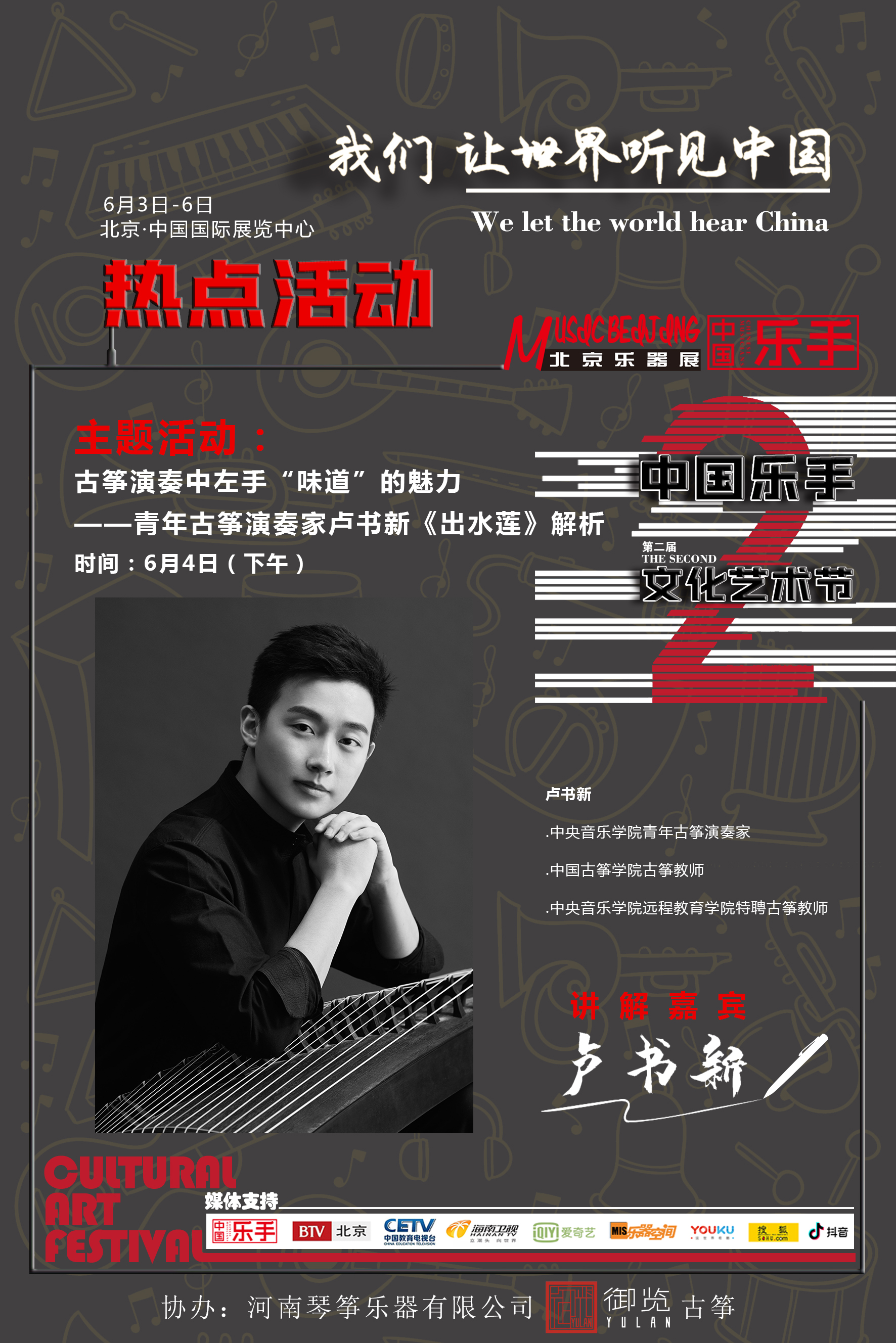 嘉賓:盧書新,青年古箏演奏家,中國古箏學院教師,中央音樂學院遠程教育學院特聘古箏教師